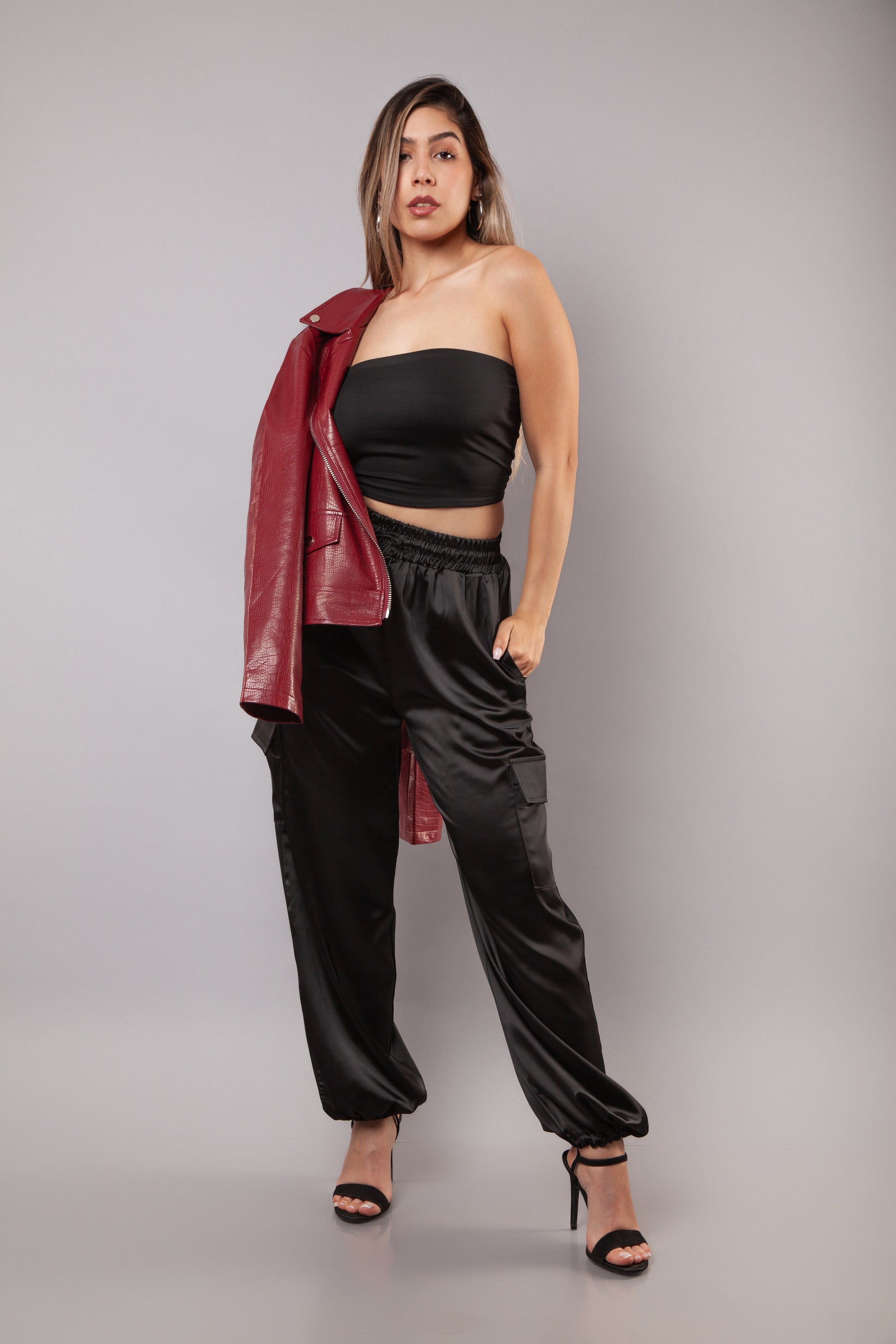Pantalón cargo en satín de primera calidad semi elasticado, con caída impecable y cintura elástica que abraza tu cuerpo sin sacrificar libertad de movimiento. Las tiras ajustables en los tobillos te permiten transformar el look: desde un corte recto y sofisticado hasta un bombacho audaz que rompe esquemas. Satinado sutil que captura la luz con elegancia. Disponible en dorado y negro, dos tonos que no pasan desapercibidos. Versátil, atrevido, irresistible.